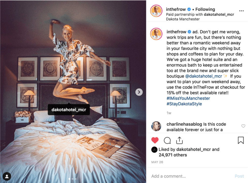 The week following the Dakota Manchester launch, we had In The Frow come and stay at the hotel – her post and stories once again generated huge interest and we were able to offer her followers and exclusive 15% off when using a special code. This will also allow us to track in a very real way the power she has.